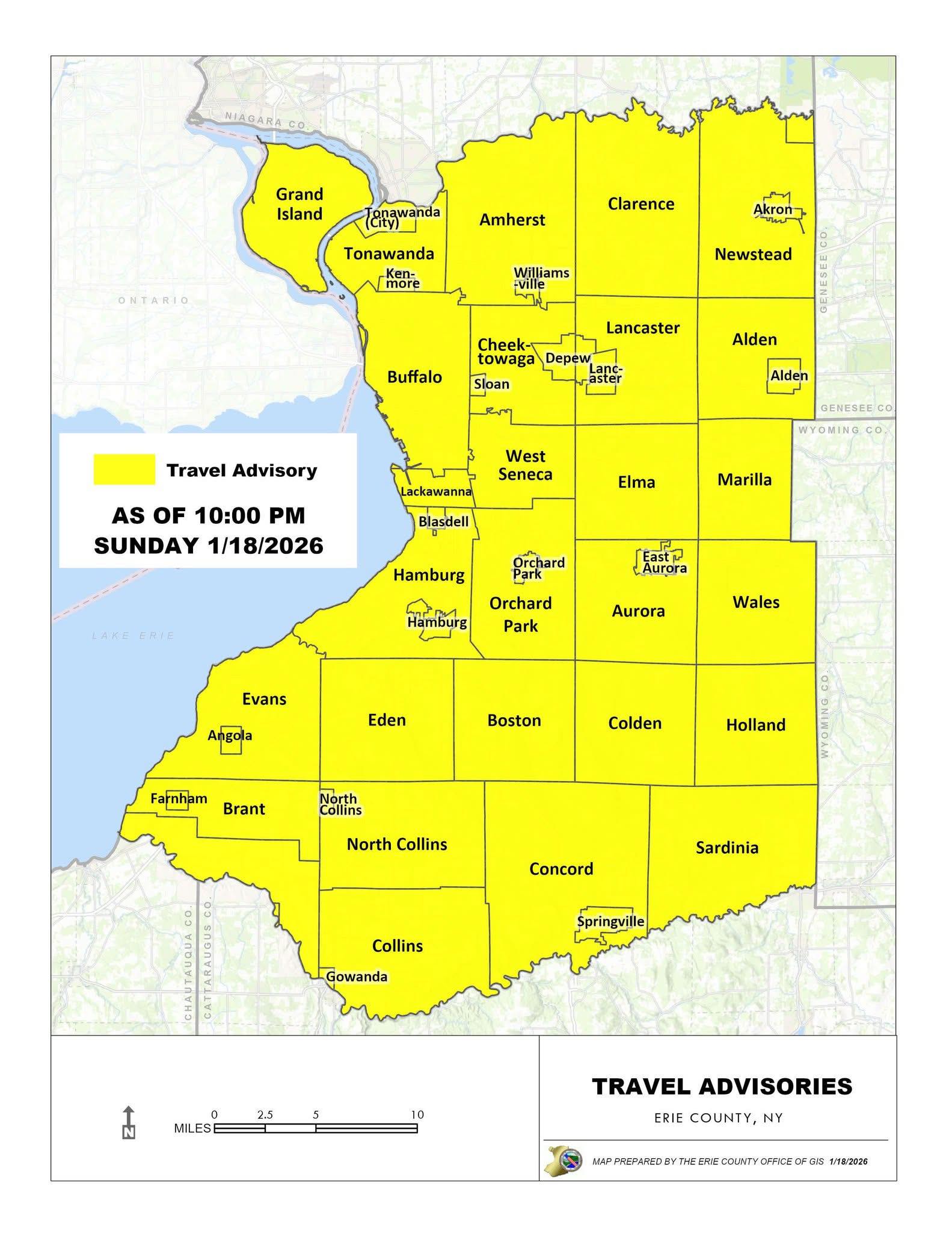 Erie County has announced that a Travel Advisory will be in effect for all of the county starting at 10:00 PM Sunday, January 18. Please avoid travel if at all possible.