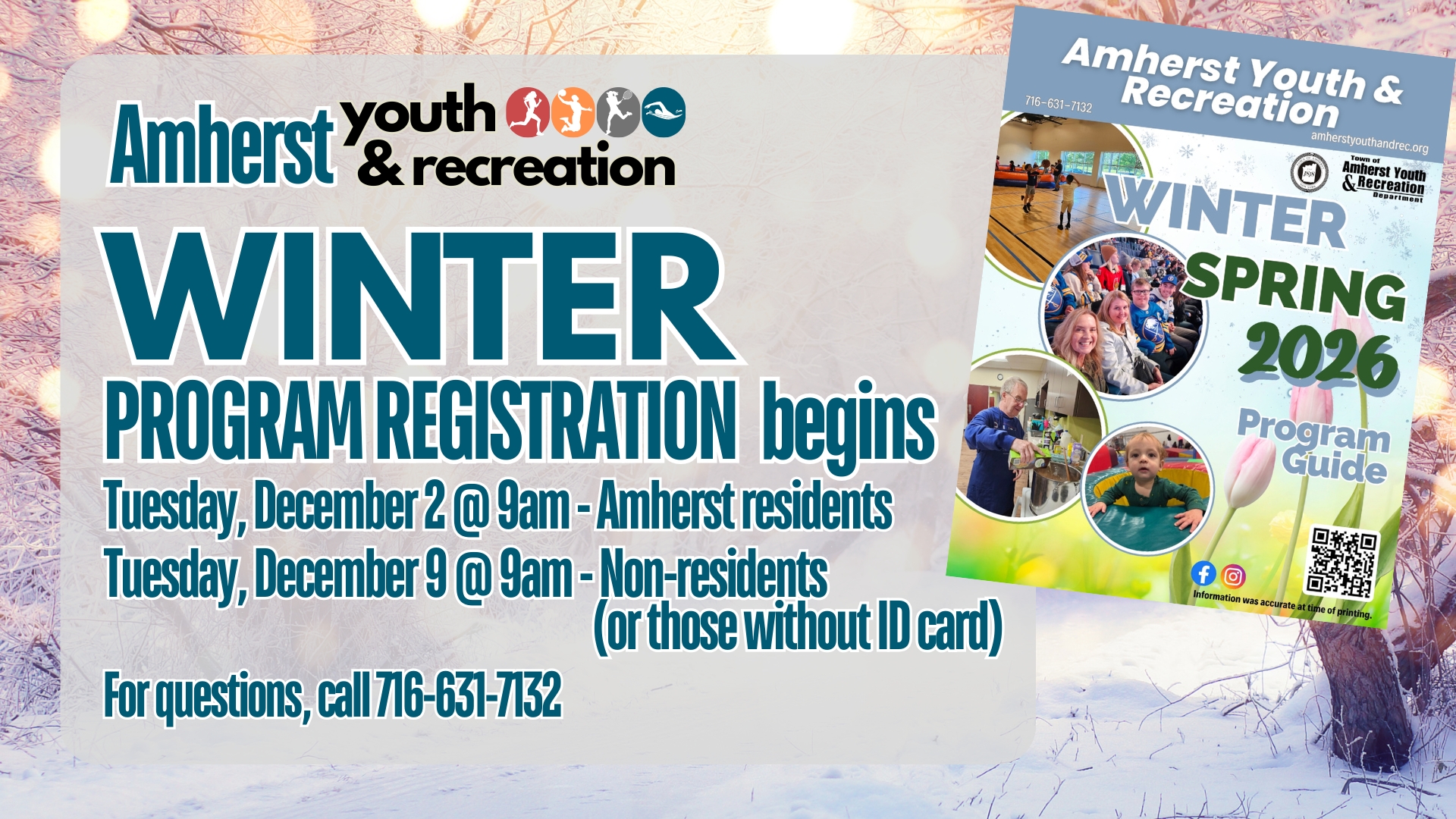 Amherst Youth & Recreation Winter Program registration will begin Tuesday, December 2 at 9am for Amherst residents with valid Youth & Recreation ID card. Non-resident registration begins Dec. 9. To view the complete season schedule visit: https://heyzine.com/flip-book/fd1950917b.html