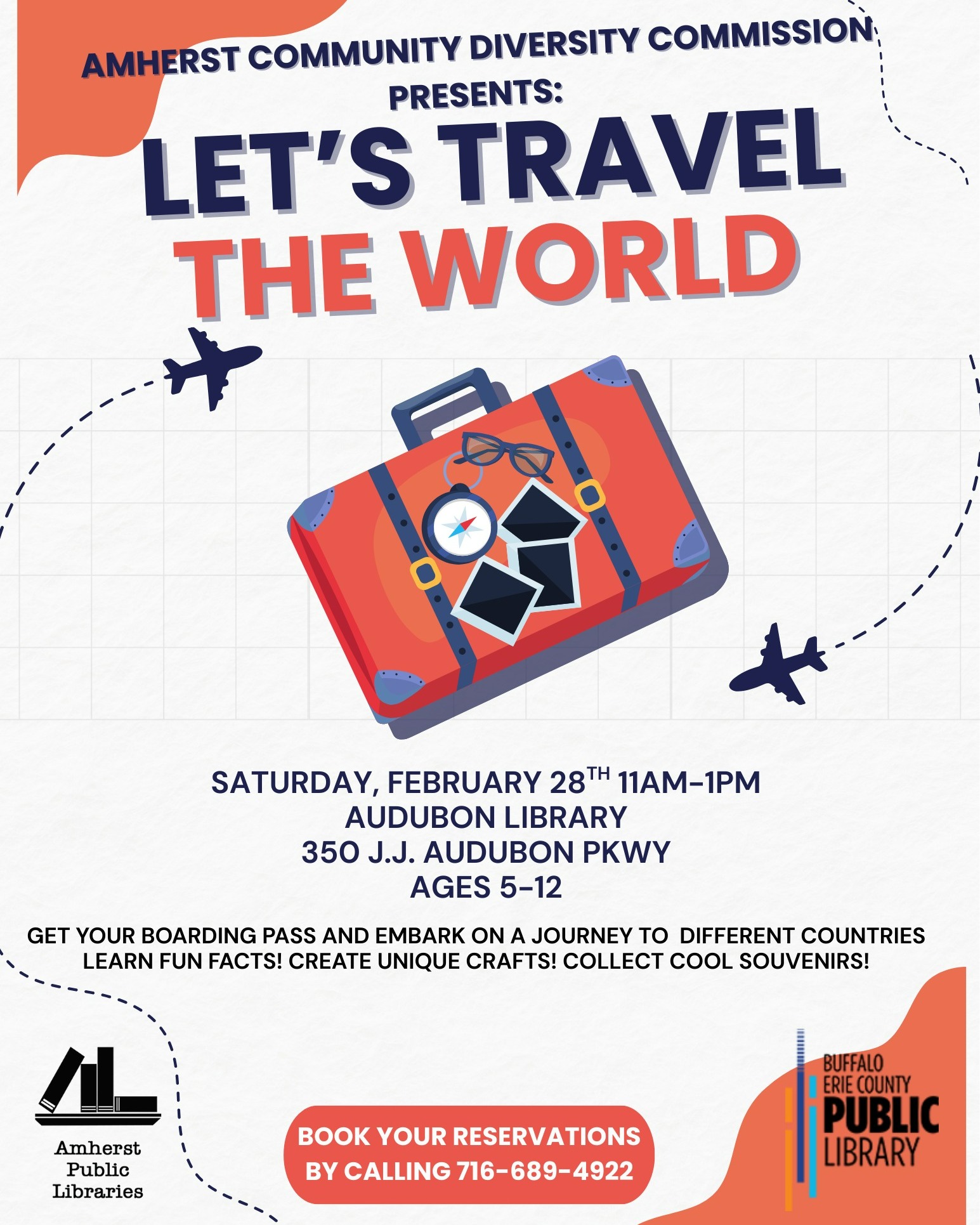 The Amherst Community Diversity Commission will host Let's Travel the World from 11 AM to 1 PM on Saturday, February 28 at the Hon. Shirley Chisholm Library, 250 JJ Audubon Parkway. Learn fun facts about different countries and collect souvenirs. See attached flyer for complete details.Posted on Feb 11, 2026 by the Office of the Supervisor