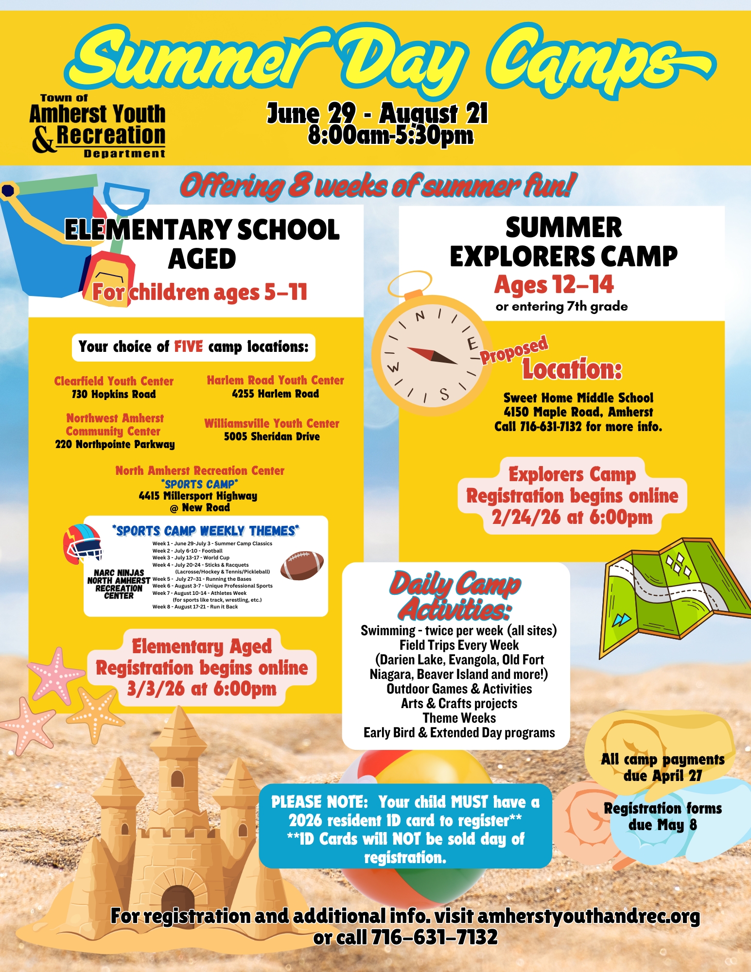 Amherst Youth & Recreation is pleased to announce Summer Day Camp registration information. So that you are prepared, please be aware that you must have a current 2026 ID card to register for these programs. Please note that registration is online only. REGISTRATION DETAILS: Summer Explorers Day Camp for ages 12-14 - Online only Tuesday February 24 at 6pm by visiting amherstyouthandrec.org. Summer Day Camps (elementary ages)-5-11 - Online only Tuesday, March 3 at 6pm by visiting amherstyouthandrec.org. If you have any questions or need assistance, please feel free to call our office, 716-631-7132.Posted on Feb 04, 2026 by the Planning Department