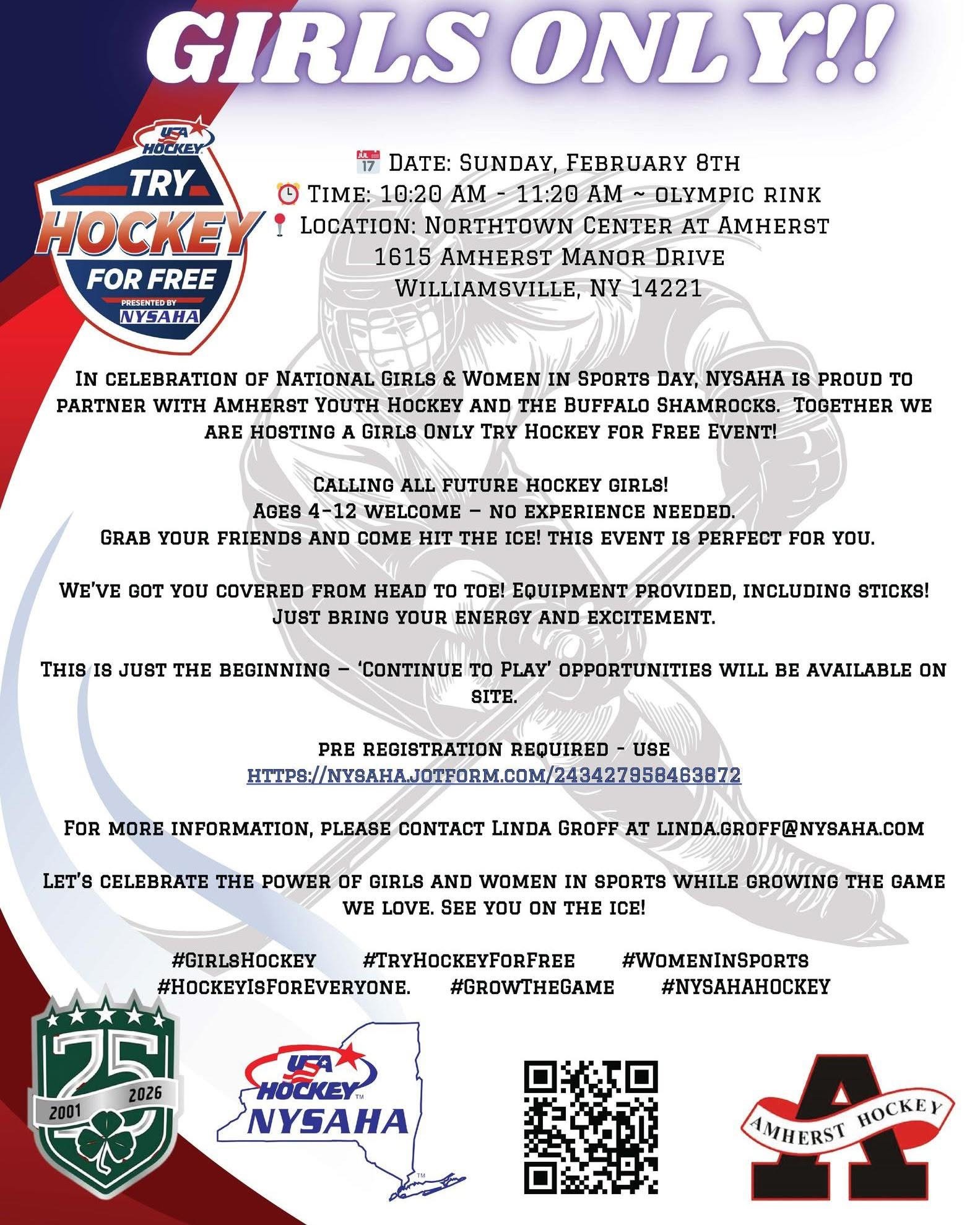 In celebration of National Girls & Women in Sports Day, NYS Amateur Hockey Association is partnering with Amherst Youth Hockey and the Buffalo Shamrocks to host a Girls Only Try Hockey for free event Sunday, February 8 at the Northtown Center at Amherst. Ages 4-12 are welcome. Pre-registration is required. Please see flyer for details, or e-mail linda.groff@nysaha.com.Posted on Jan 30, 2026 by the Office of the Supervisor