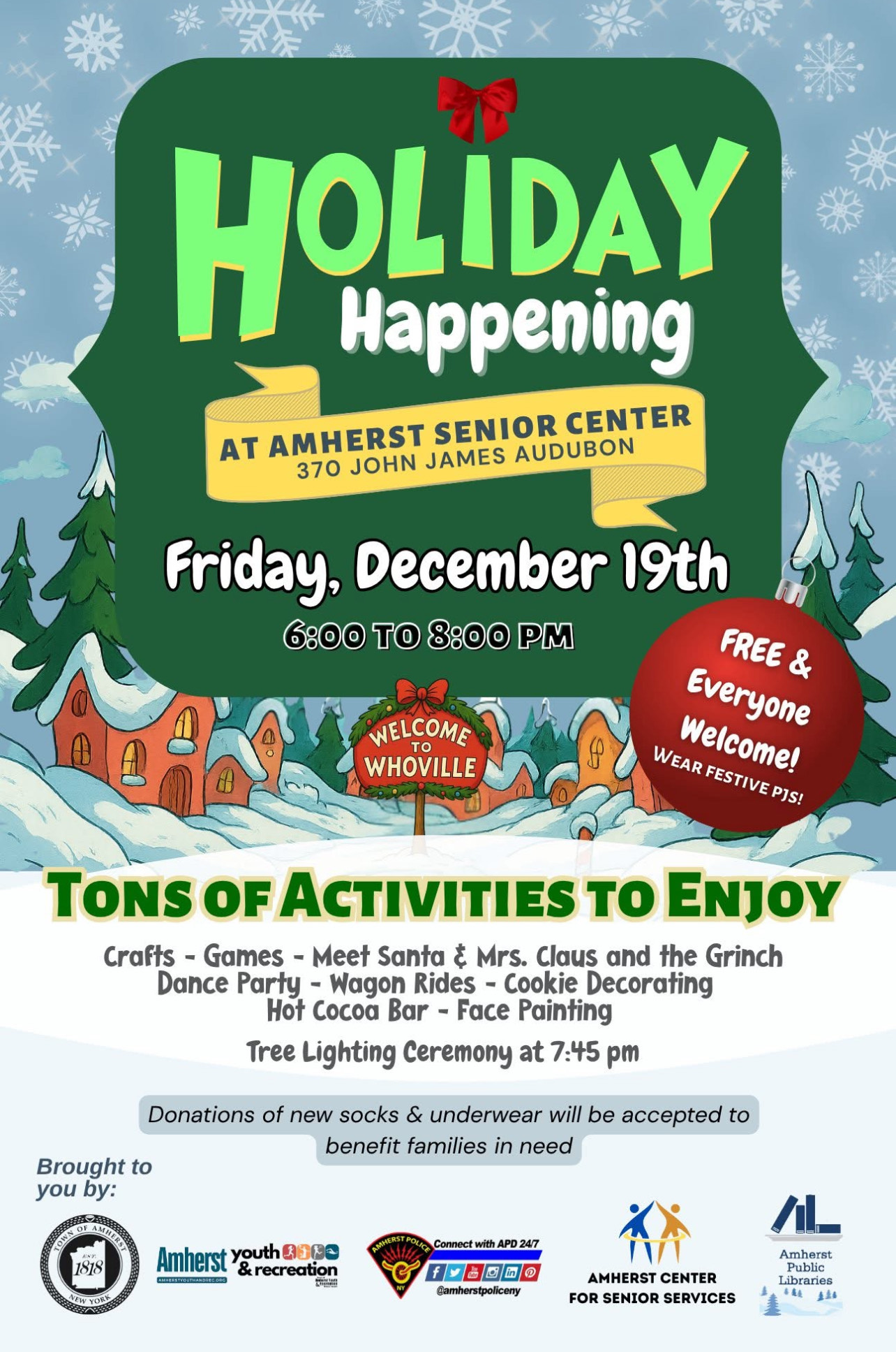 Welcome to our version of "Whoville." Join us for a FREE and family-friendly celebration on Friday, December 19, from 6pm-8pm at the Amherst Senior Center inspired by the beloved character, the Grinch! Visit with Santa, Mrs. Claus, and the Grinch. Enjoy indoor and outdoor activities, including wagon rides, a dance party, face painting, cookie decorating, a hot cocoa bar, and a tree lighting ceremony (at 7:45 pm). Don't forget to wear your festive pajamas! Plus, we will be collecting donations of new socks and underwear to benefit local families in need. Holiday Happening is brought to you by the Town of Amherst, Amherst Youth and Recreation, Amherst Police Department, Amherst Center for Senior Services and Amherst Public Libraries.