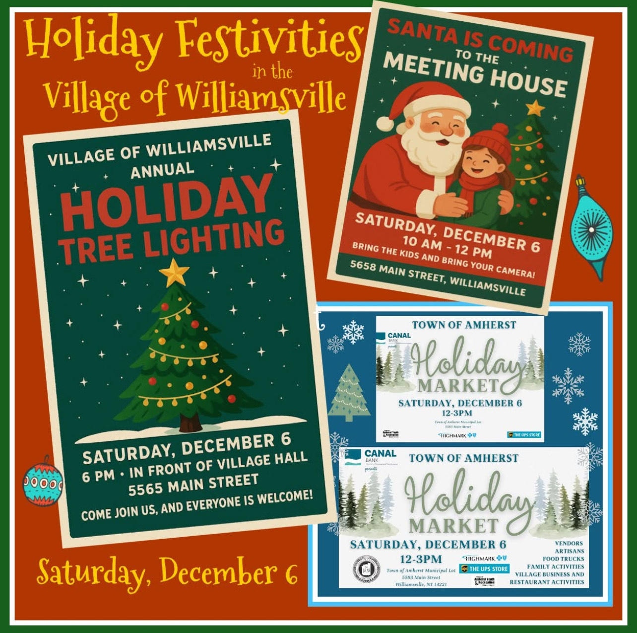 Holiday in the Village of Williamsville! An amazing outdoor Town/Village holiday market sponsored by Canal Bank, featuring over 30+ vendors next to Town Hall & Library, tons of great unique shops & locally owned restaurants to visit all day, FREE trolley bus moving you up and down Main Street to soak it all in all day from 10am-5pm, Santa Claus will be in two spots for photos Meeting House and Williamsville Lehigh Valley Depot and then to wrap it up the Annual Tree Lighting in front of Village Hall! Bundle up, grab a friend and make it a day in Williamsville! (Trolley brought to you by Jolly Boys of Williamsville The Eagle House Restaurant and Marty's Formal Wear )