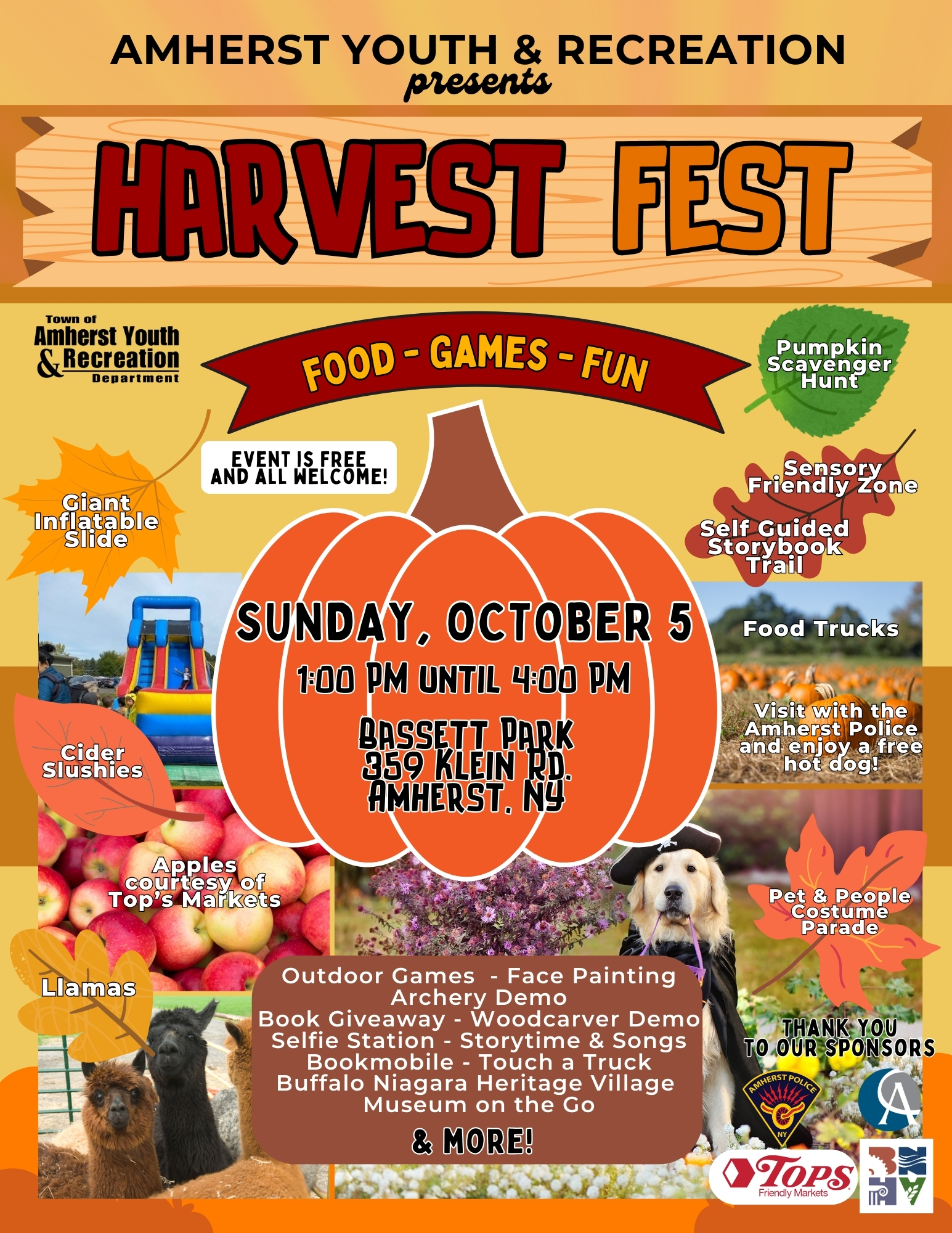 Come out and celebrate the beginning of the fall season with us Sunday, October 5 when Amherst Youth & Recreation will host its annual Harvest Fest! The fall celebration runs from 1pm-4pm at Bassett Park (corner of Klein & Youngs Rd.). Harvest Fest promises to deliver a delightful experience full of festive autumn cheer. All are welcome to enjoy delicious food, outdoor entertainment and games for all ages including a pet and people costume parade, scavenger hunt, pumpkin weight guessing game, giant inflatable slide, sensory friendly zone, self guided storybook trail and so much more!